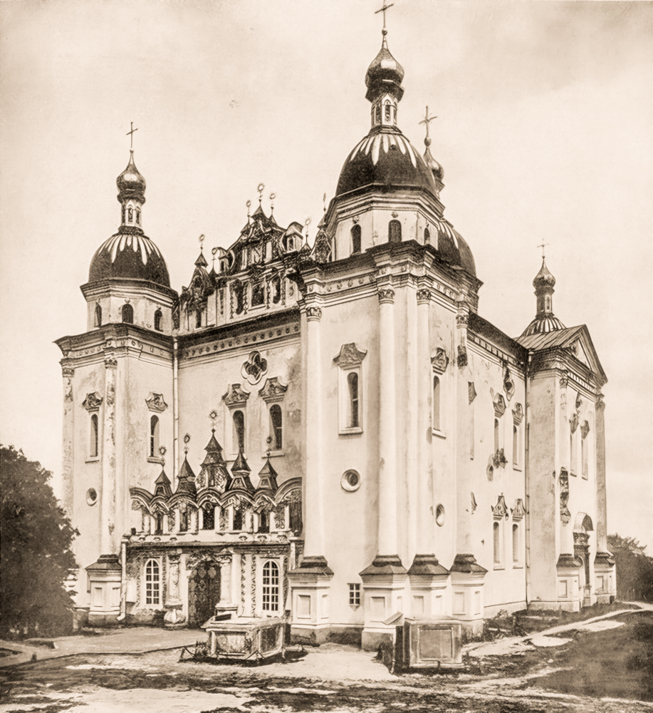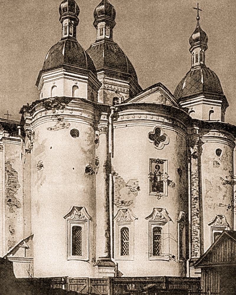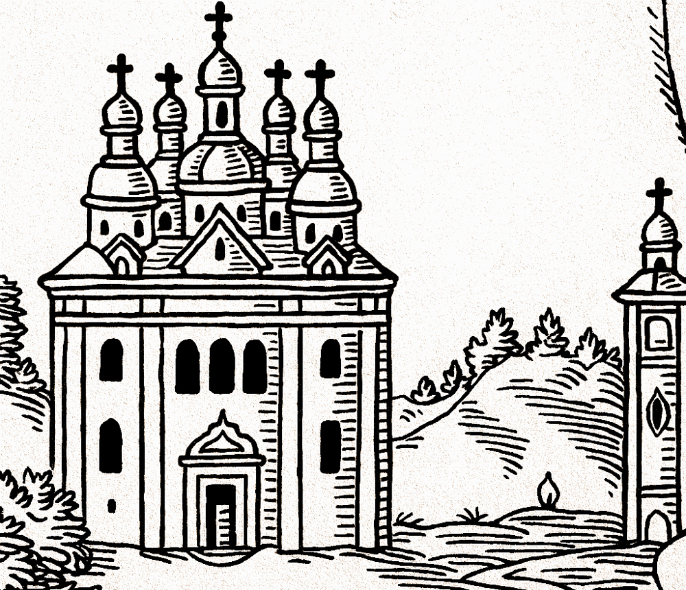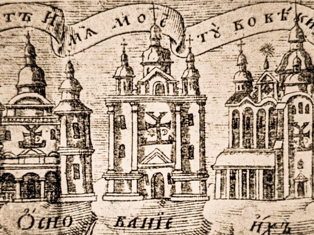 Микільський собор, за фрагментом гравюри зі Святим Миколаєм, майстер Тит, книга «Пречестныи акафисты всеседмичныи…», 1706 р.