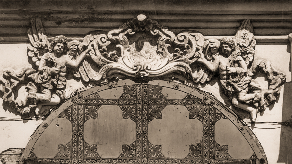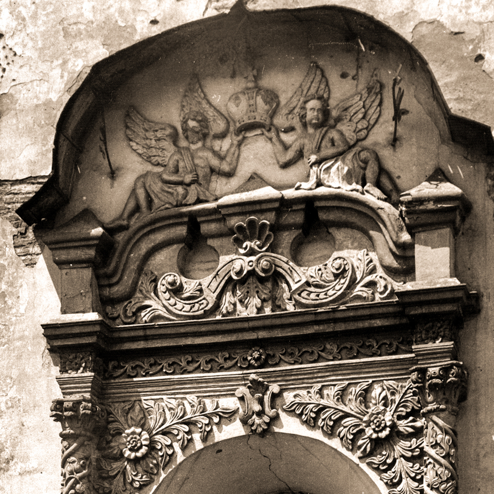 Ліпні янголи над північним порталом Микільського собору, Київ, світлина 1930-х рр.