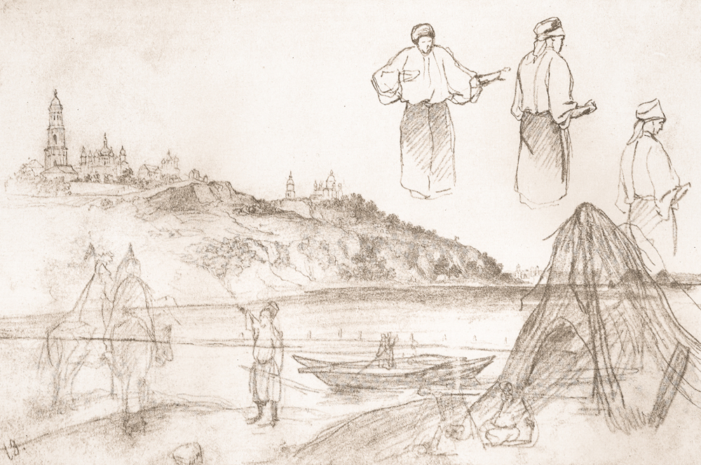 Київ з-за Дніпра (Микільський собор по центру), начерк Т.Г. Шевченка, 1843 р.