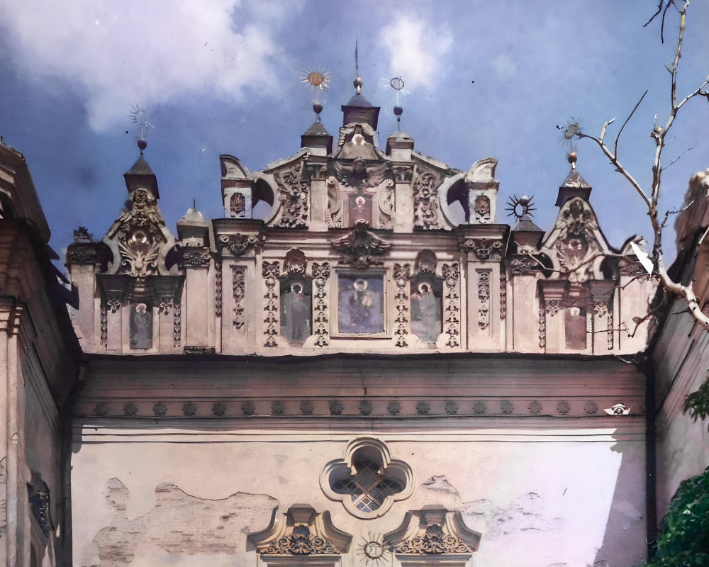 Завершував цей новий притвор неймовірної розкоші фронтон. Утворений п’ятьма арками і двома напіварками по краях, він був вкритий рослинною ліпниною, мушлями й медальйончиками чи не надмірно рясно. За настроєм й в нюансах тут простежувався істинний рокайль – вичерпна ознака мистецького переходу від пізнього бароко до буйної агонії рококо. До того ж всю цю пишну красу вінчали окремі скатні завершення із сонцями-рипідами на пірамідальних главках.