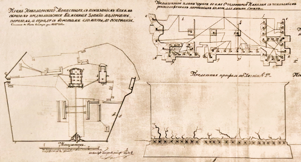 Фрагмент плану підриву мурованих будівель Микільського монастиря із підписоми: «План Николаевского Монастыря с показанием каким образом предполагается Каменныя Здании подорвать порохом, а ограду с воротами сломать до основания. Сочинен в Киеве 2 января дня 1812-го года» й «Увеличенный план церкви во имя Св. чудотворца Николая с показанием расположения пороховых камер для взрыва стен» і «Продольный профиль по линии №2»