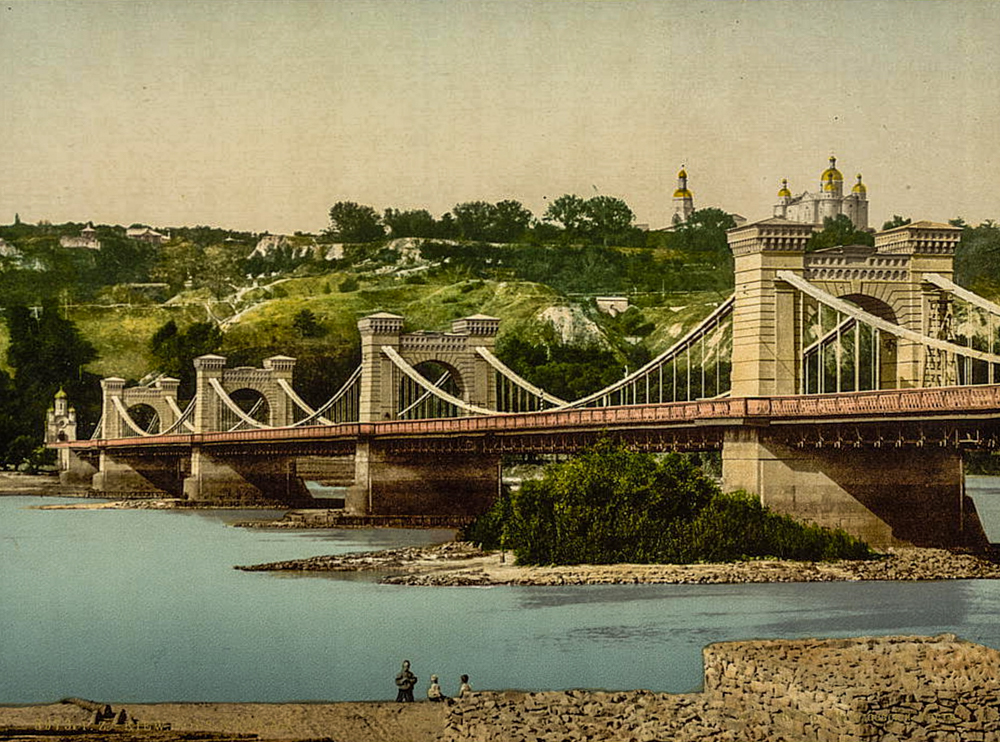 Микільський монастир в панорамі Києва, на передньому плані Миколаївський ланцюговий міст, листівка кінця XIX ст.