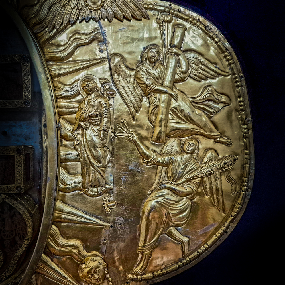 Пізніший кіот роботи українських золотарів – яскравий взірець вітчизняного художнього карбування. Особливої уваги вартують образи біблійних персонажів і вигадливий архітектурний ансамбль на нижній пелюстці.