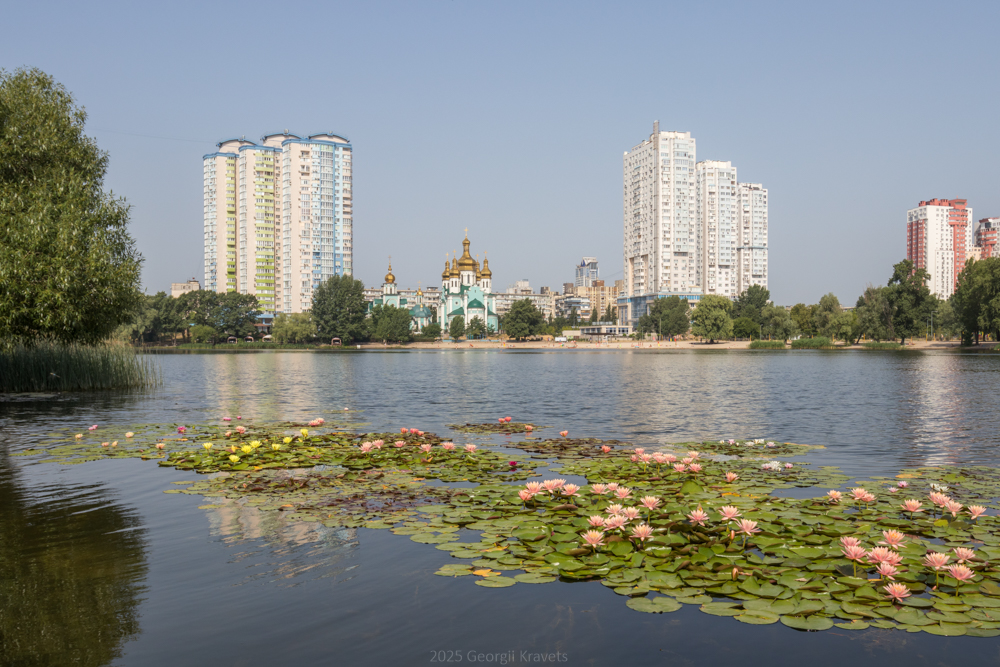 Вид на храмовий комплекс Різдва Христового з озера Тельбін, Київ